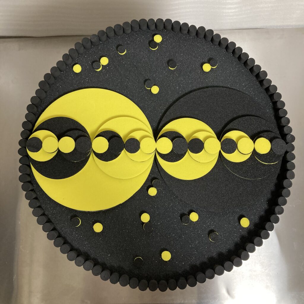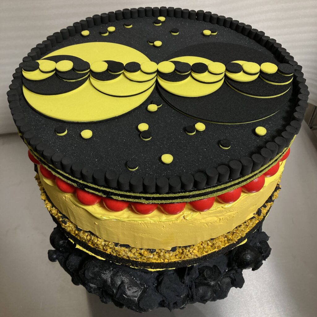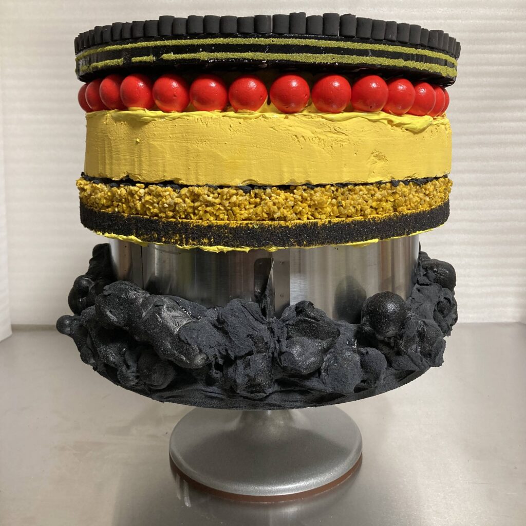 《アトミック・ケーキ(ウラン-235)》は、ウランという原子力技術の基底にある物質をモチーフにしたケーキ型の彫刻作品です。ウランと核燃料の製造過程で生成される物質のイメージからこの作品は構成されます。